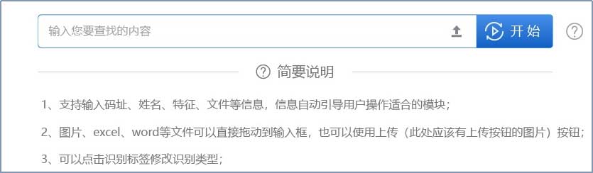 建設(shè)統(tǒng)一入口界面,實(shí)現(xiàn)用戶的多種輸入方式,包括但不限于各類(lèi)碼址、名稱、地址、特征片段、數(shù)據(jù)文件、文檔文件等。支持通配符方式;支持中英文兩個(gè)語(yǔ)種的輸入支持和判斷,支持中英文混合輸入;支持多條信息或文件的輸入。